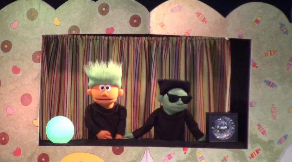 Na een half uur tovert de kindergoochelaar het podium in enkele seconden om tot een poppentheater. Het is tijd voor de poppenkast voorstelling ‘De tovenaar van Tim’.